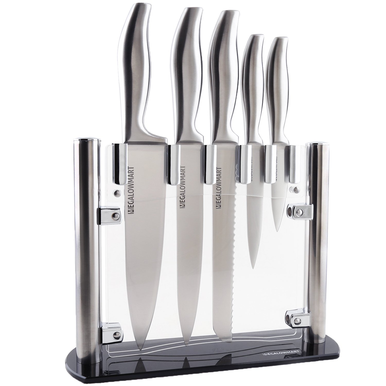 At under $14, you can afford to buy this stainless knife set that comes with an attractive acrylic stand. It lets you view your knives while protecting them in a sleek, space-saving way.